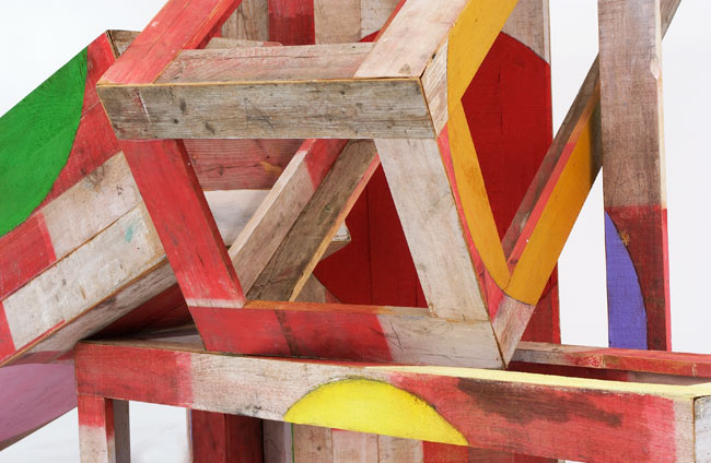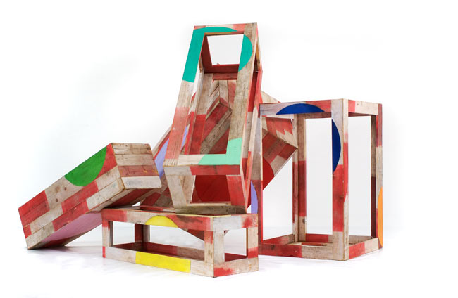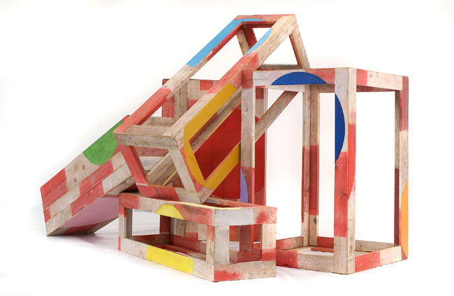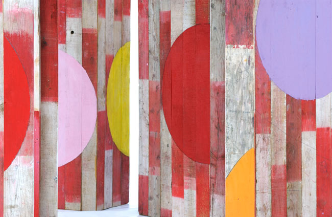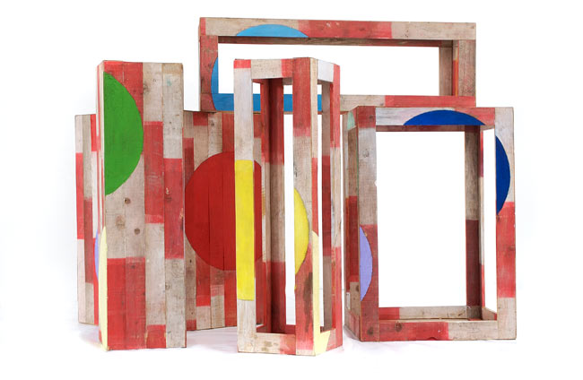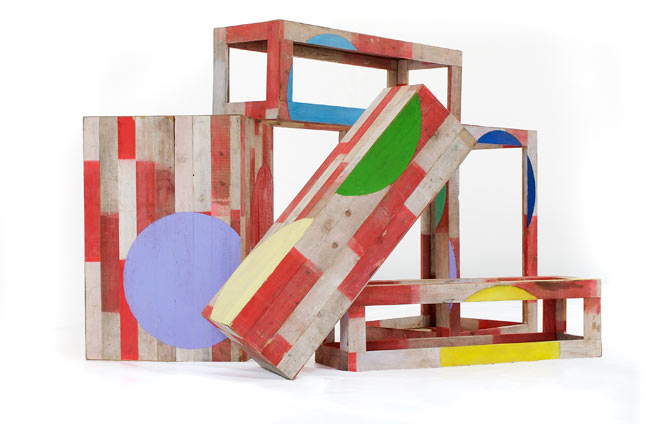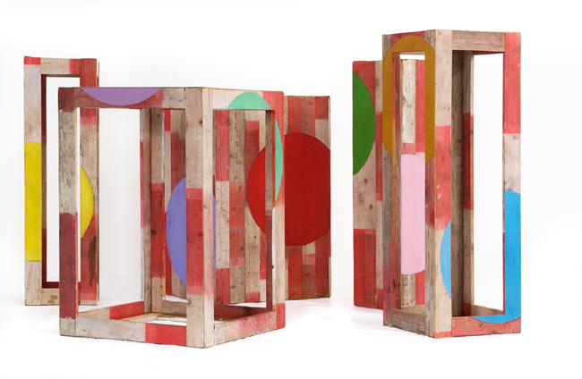 Genormte Baustellenbretter und die genormten Größen von Verkehrstafeln bezeichnen die Kreise und Größenverhältnisse der einmal als Gerüst und einmal als Vollholzkubus konstruiert wurden. Die sauber auf Nut gearbeiteten Kisten entsprechen einander exakt im Rauminhalt. Die bonbonfarbenen Kreise sind, auch wenn sie nur teilweise ausgeführt wurden, umfänglich alle gleich. Als Skulptur sind als Multiple gedacht und beliebig aufstellbar. Sie kommunizieren wie alle Baustellenbretter untereinander wie eine gute Tischrunde.
