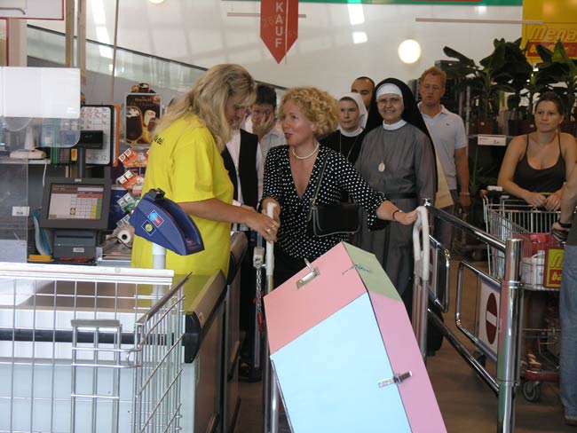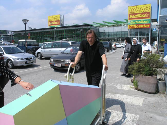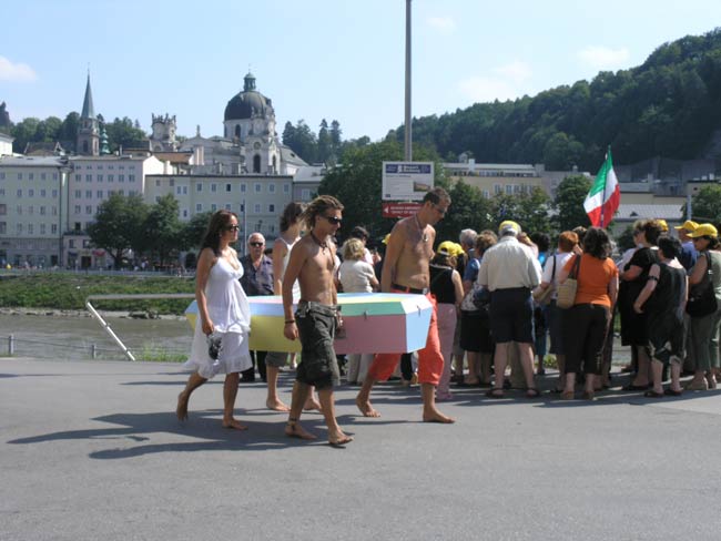 Charles Kaltenbacher kommentiert: Schlingensief in den 90er Jahren als imposanter, eloquenter Surfer auf der angesagten Welle des sozialen Engagement (5 Millionen Arbeitslose - ich kümmere mich darum) aufgetreten, zeigt sich hier als Parsifal mit Hoden, den das Volk gefälligst zu beachten hat. Das Thema der Hoden wurde übrigens von Matthew Barney in seiner Cremaster-Serie in den 90er Jahren thematisiert. Welch Leichtigkeit im Spannungsfeld >zwischen Objekt, Akteur und Bühne möglich ist, zeigt eine frühe Videoarbeit von Franz West - Passstücke in Gebrauch, Titel De Cohen Kabo West, 1983/84 -, welche die Schwere aktionistischer Opferhaltung mit "Leichtigkeit überwunden hat und spielerisch den "galanten Wiener Charme" Wests zeigt, mit dem er international reüssierte. Die Ausstellung läuft bis 8.10.2006 Ein umfangreicher Katalog ist erschienen.Salzburg allgemein: Nach dem Ausstellungsbesuch sitzt man im hirschgeweihbestückten, von Matteo Thun gestalteten Museums-Cafe-Restaurant und wartet eine 1/2 Stunde auf das mehrmals georderte Bitter Lemon während draußen die Salzburger Schützen mit Böllerschüssen die Festspiele mit Donnerlärm eröffnen und daran erinnern, dass in den nächsten Wochen Salzburg ein Laufsteg von Reich, Schön, Einflussreich und kulturbeflissen ist. Auf die Stadt blickend ertappt man sich dabei, Erleichterung zu verspüren bei dem Gedanken, den Ort zu verlassen, an dem Dirndlkleid und Strapse eine äußerst lukrative Symbiose eingehen. Thomas Redl