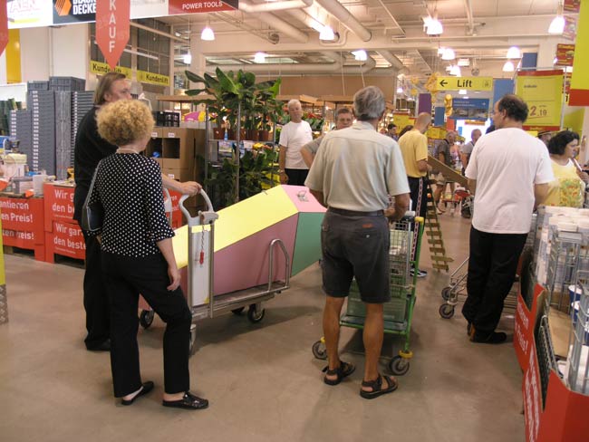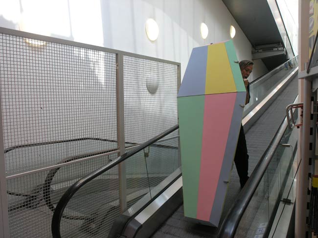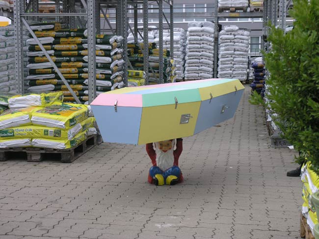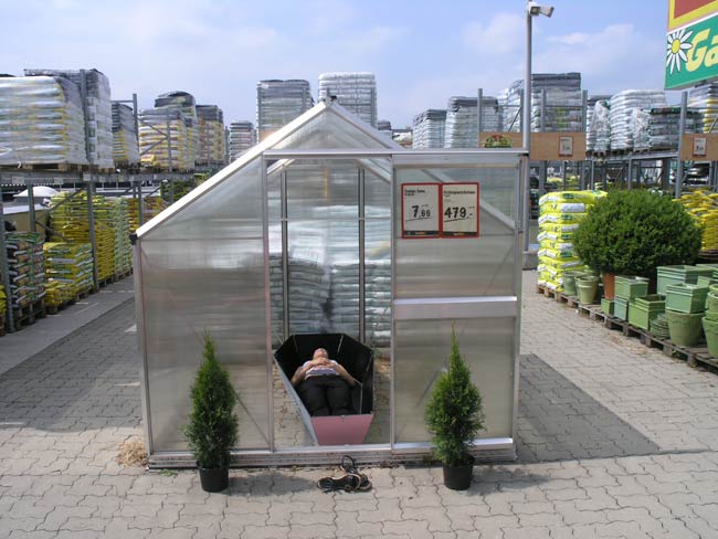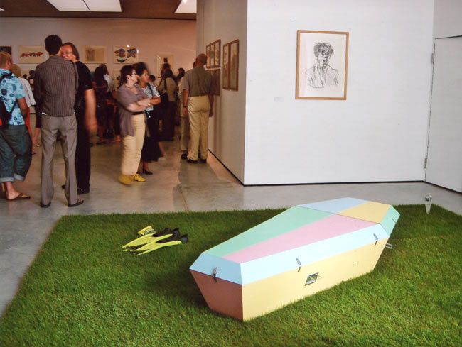 Campingsarg versus Schlingensiefs Hodenpark im Kampf um die letzte Bühne als möglicher Attraktor. Der in Salzburg lebende Künstler und Literat Max Bläulich hat einen zusammenklappbaren Campingsarg installiert, laut beigelegtem Prospekt in Bauhäusern zu kaufen, der die Frage nach dem "letzten Raum" aufwirft. Dem gegenüber ist Schlingensief mit seiner Installation chicken balls - der Hodenpark vertreten als eingeübte standardisierte Provokation. Spekulativ eingesetzt drängt sich die Frage auf, ob diese Ausstellung es notwendig hat, Schlingensiefs Zitatemix als Medienereignis einzusetzen. Während der Eröffnungsrede baute Schlingensief an seiner Installation - ein Störungsakt mit Hammer & Bohrmaschine.