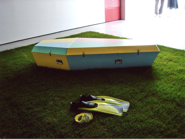 Campingsarg versus Schlingensiefs Hodenpark im Kampf um die letzte Bühne als möglicher Attraktor. Der in Salzburg lebende Künstler und Literat Max Blaeulich hat einen zusammenklappbaren Campingsarg installiert, laut beigelegtem Prospekt in Bauhäusern zu kaufen, der die Frage nach dem "letztem Raum" aufwirft. Dem gegenüber ist Schlingensief mit seiner Installation chicken balls - der Hodenpark vertreten als eingeübte standardisierte Provokation. Spekulativ eingesetzt drängt sich die Frage auf, ob diese Ausstellung es notwendig hat, Schlingensiefs Zitatenmix als Medienereignis einzusetzen Während der Eröffnungsrede baute Schlingensief an seiner Installation - ein Störungsakt mit Hammer & Bohrmaschine.