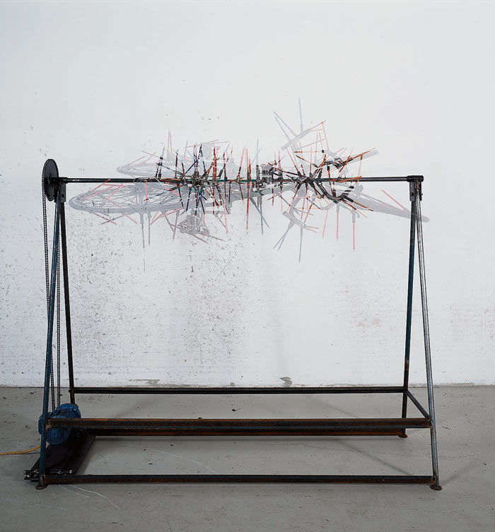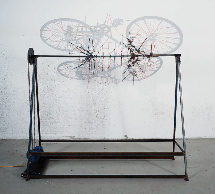 Jedes Wort ist eine Verfremdung, genauso wie jedes Zeichen. Jede Hand verfremdet die ursprüngliche Idee, wie jedes Wort eine Verwässerung darstellt. Wörter und Zeichen sind Annäherungen an Gedachtes. Die Irritation ist die Eindeutigkeit mit der sich das im Kopf schon Irrende gesagt oder gezeichnet wird. Der eindeutige Ausdruck ist nur mehr das Double irgendeiner Idee. Die Renn-Maschine wird zur Schreib-Maschine, die verkehrte Bewegung zur elektrisch betriebenen Bewegung und das untergelegte Papier zum Träger eines mechanischen Vorgangs, der nur mehr von der Bewegung des Papiers veränderbar ist.