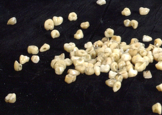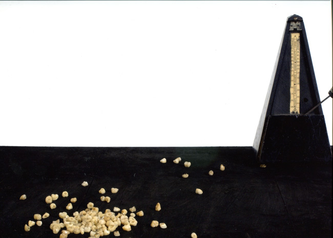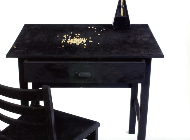 Sessel, Tisch, Metronom und eine Handvoll Zähne. Eingetaucht in schwarzes Pigment liegen weiße Zähne wahllos zwischen Zeit und Ewigkeit herum. Funktionslos, herausgelöst aus dem Kiefer modern sie nicht, bleiben wie Felsen in einer Landschaft wie Zyklopenstein liegen. Längst ist das Metronom zur Ruhe gekommen, Sessel und Tisch verraten die einstige Anwesenheit von einem Menschen. Sind es seine Zähne, sind es Zähne eines X-beliebigen, sind es ein deutungsleichte Artefakte? Diese Installation ist offensichtlich nochmals eine Beschäftigung mit dem Shakespeare Wort: Zahn der Zeit!